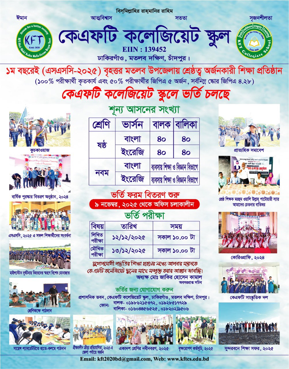 ভর্তির জন্য কেএফটি কলেজিয়েট স্কুল থেকে ফরম সংরক্ষণ সংগ্রহ করতে হবে এবং ভর্তি পরীক্ষায় অংশগ্রহণ করতে হবে ।